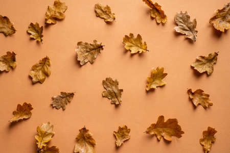 Autumn pattern made of dry oak leaves on brown background. Flat lay, top view.