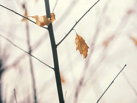 Female hand holds dry autumn leaf of poplar on brown studio background