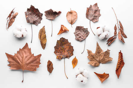 Flat lay top view of yellow, orange, brown, gold and red colors autumn leaves at the bottom of the image on white background with space for text