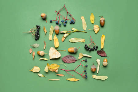 Beautiful autumn composition with acorns, berries and forest decor on color background