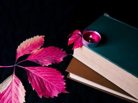 Dry flowers and leaves lie on a dark surface, on the left a fragment of a round glass vase, part of the background is blurred. Empty place for text, a distant plan blurred, orange autumn colors.