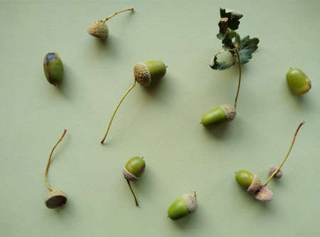 green oak acorns evenly spreaded on textured paper, herbal wallpaper background, vertical