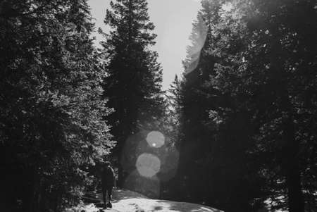 The sun shines in the branches of a tree and the wind sweeps its snowflakes from the tree and creates a wonderful glitter effect