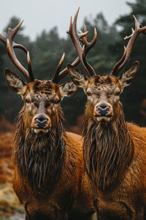 A captivating close-up of two red deer with majestic antlers, standing together in a wintry forest with falling snowflakes, creating a serene and natural atmosphere.
