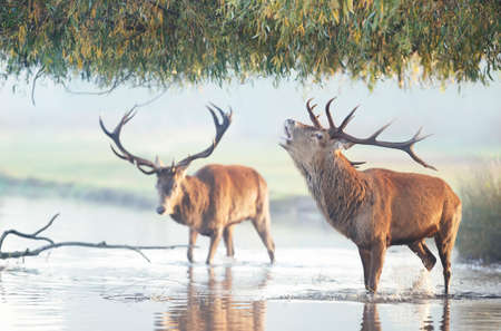 Close-up of a Red deer stag standing in water and calling during rutting season on a misty autumn morning, UK.