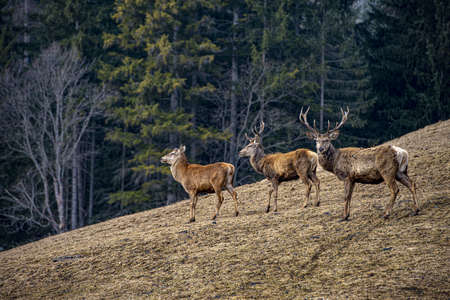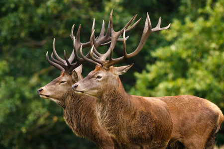 Herd of red deer stags with antlers in velvet in summer. Wild animals in natural environment. Wildlife scenery from the woods..