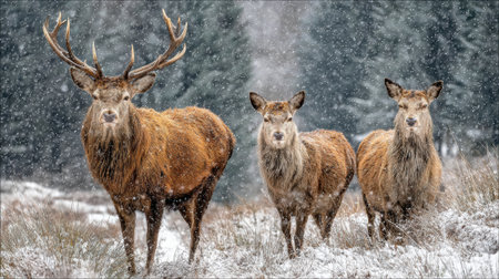 A striking image of a large stag with impressive antlers standing alongside two female deer in a serene, snow-covered forest.