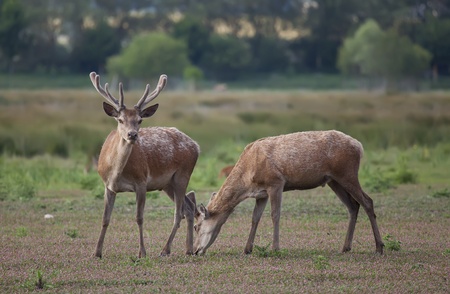 Wild old male red deer is looking to camera by the female red deer on green grass.