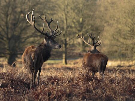 Close-up of a red deer stag with a hind during rutting season in autumn, UK.