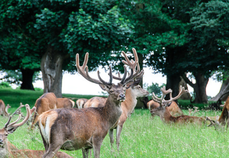 Deer’s in Richmond park England united kingdom, deer’s are either standing and looking, running, eating green grass, with family walking around or relaxing in sun. Beautiful green grass and green trees in background a typical summer day in Richmond pa