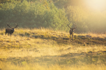 Epic image of herd of red deer stags Cervus Elaphus in glowing golden dawn sunlight in forest landscape scene with stunning light