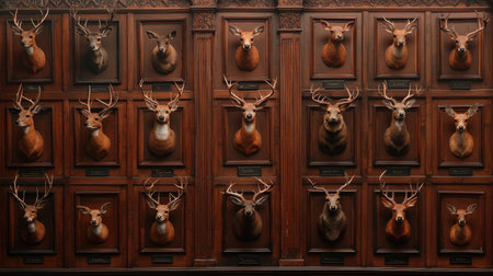 An elaborate display of taxidermy deer heads mounted on a wooden wall, creating a vintage lodge atmosphere with rustic charm and artistic flair.