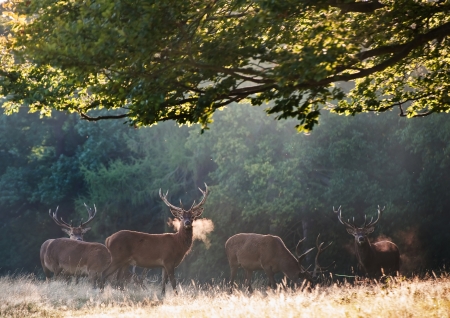 A red deer (Cervus elaphus) in rutting seasons loudly trumpets during the morning haze in autumn in Dyrehave Royal Park, Denmark. Steam from the mouth.