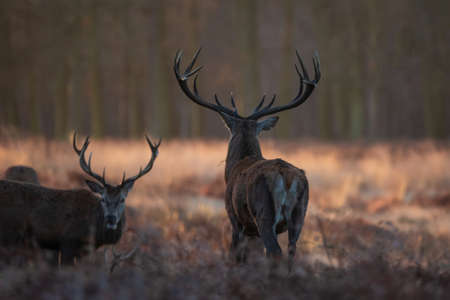 Red deer male, cervus elaphus, with big antlers rutting during mating season on a landscape with field, forest, hills and a beautiful sunset