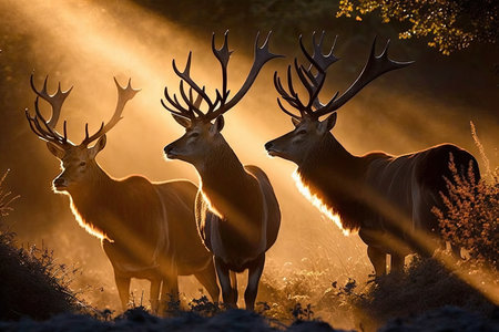Experience the allure of three stags bathed in dramatic lighting. Their impressive antlers and serene expressions convey the beauty and power of wildlife in a natural setting.