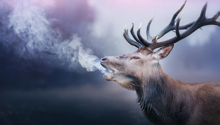 A stag with large antlers is displayed against a dark background, accented by orange abstract elements resembling flames or leaves. The image presents a dramatic composition with focused lighting. Potential uses include editorial illustrations, artistic projects, and various visual media.