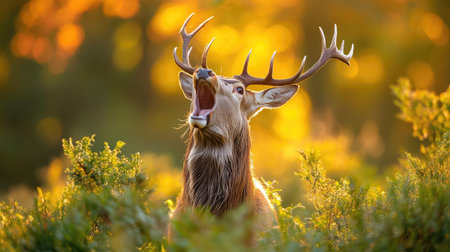 Red deer stag calling during rut with open mouth in a forest clearing during golden hour