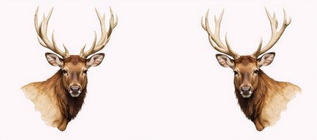 Two deer with antlers stand side by side in a calm minimalistic setting with a light background exuding tranquility and elegance.