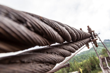 Close-up on a metal binding cable going in perspective to the bridge support with the texture of a summer sunny day. Reliability and strength concept, architecture.