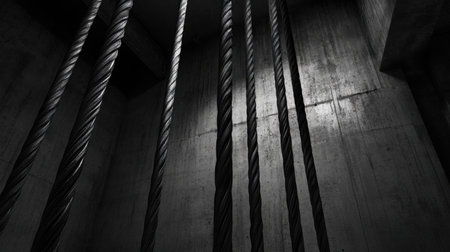 A captivating monochromatic image featuring twisted cables and rugged concrete walls that create a striking industrial environment. Perfect for various creative projects.