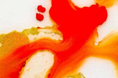 red, orange, yellow, brown white and gold liquid bright aquarel colors with oil generate fluid structures and bubbles in