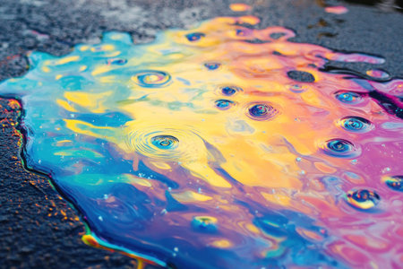 Rainbow oil spill on wet asphalt surface creating colorful pollution texture and abstract background