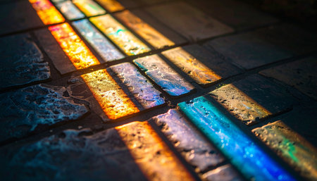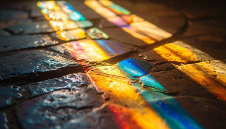 Top down view sunlight through stained glass casting rainbow prisms on ancient stone floor, dust motes, sacred geometry.