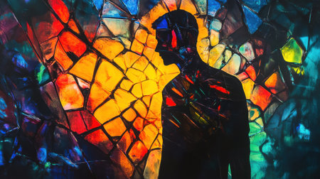 Silhouette of a person against a colorful stained glass window during evening light