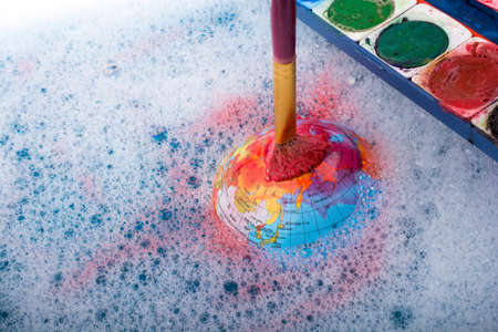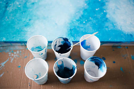 arts and craft hobbies concept, blue and white acrylic painting with colors in plastic cups and mixed painting tools next to it while the work is in progress