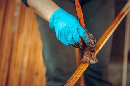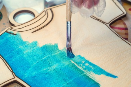 Paintbrush in woman's hand painting the old wood with blue paint. Creative design, house renovation theme, DIY concept
