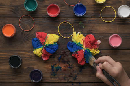 A woman applies paint with a brush to a set of underwear in the style of tie dye. Staining fabric in tie dye style.