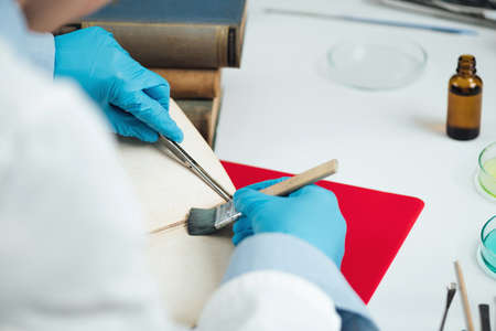Antique book restoration. Book restorer repairing damaged pages in an antique book