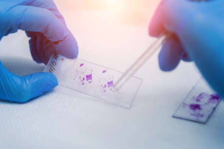 stained glass slides of peripheral blood smear with violet leishman giemsa stain in hematology pathology laboratory