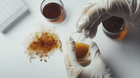 A laboratory technician conducts a detailed analysis of various liquid samples in glass beakers, showcasing professionalism and precision in a clean research environment.