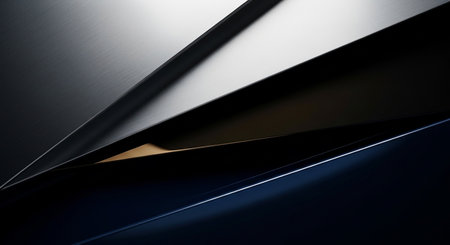 Close up of a highly reflective metallic panel featuring a radiating circular brushed pattern, highlighted by strong white and subtle blue light reflections contrasting with dark shadows.