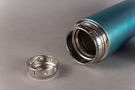 Close-up of bottle neck with open cap on white background with copy space. Reusable steel thermo water bottles. Plastic free; zero waste.