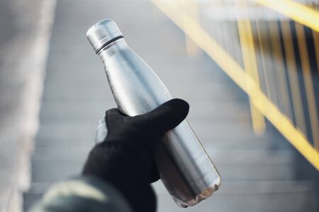 Close-up of male hand holding dressed black glove, holding used reusable steel thermo water bottle on blurred background of urban stairs.