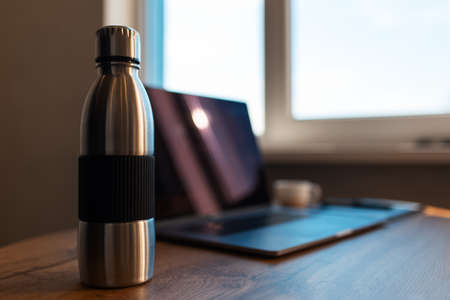 Dark close-up photo of steel reusable thermo water bottle on blurred background of laptop.