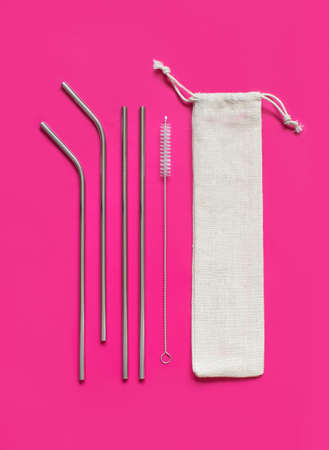 Reusable stainless steel straws and cleaning brush with cream cotton bag on pink background. Eco friendly lifestyle concept
