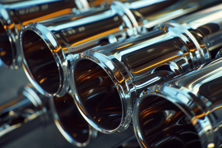 A close up of a group of metal pipes as industrial background. pipes are silver and have a shiny appearance. Concept of industrial Chemical pharmaceutical device