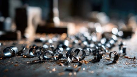 A captivating view of metal rings and shavings scattered on a workshop table, showcasing the beauty of craftsmanship in an industrial setting.