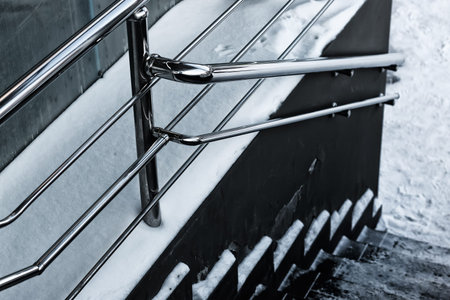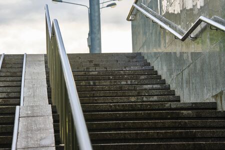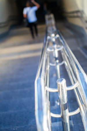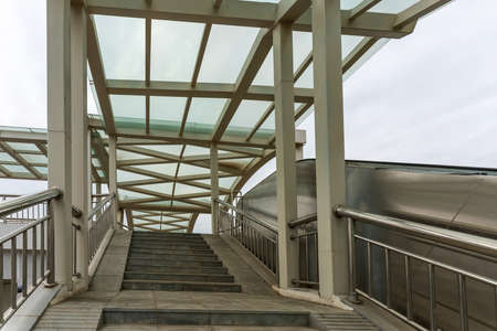 front view of outdoor staircase to pedestrian walkway with glass fence and metal railing at train station, selective focus.