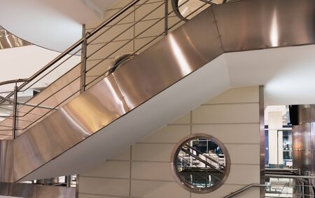 Stairway Electric Escalator of Shopping Mall, Modern Indoor Escalators and Interior Decoration in Shopping Supermarket. Perspective View of Empty Luxury Staircase Escalator, Facility Building.