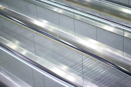 View from above of modern empty glass and metal multi-line escalator inside of train station building, airport or a mall, wide-angle shooting indoors, multiple glossy reflections