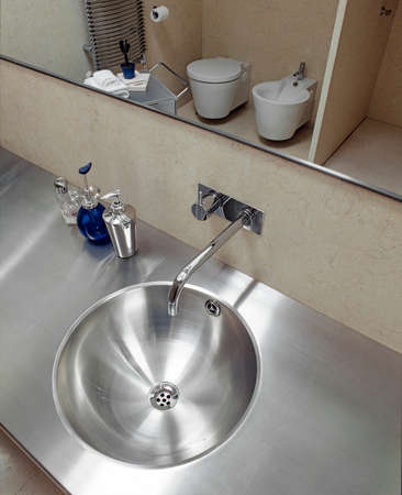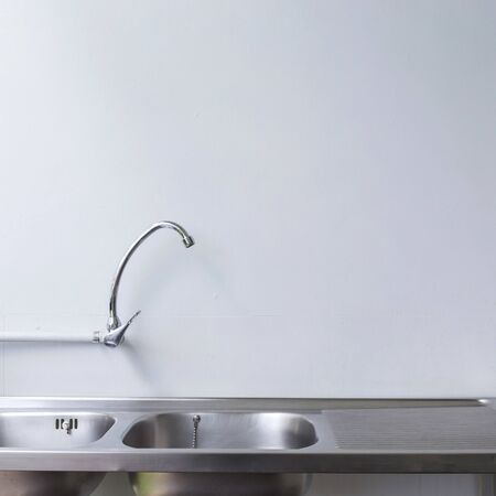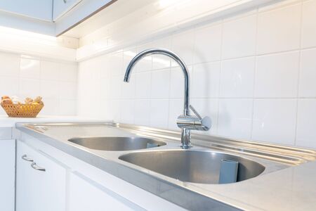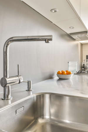 Close up on modern kitchen metal faucet and metal kitchen sink.