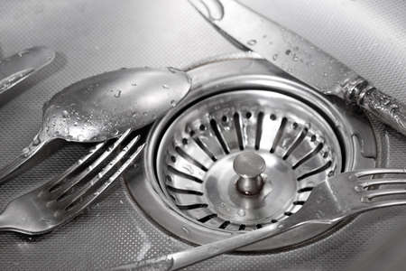 Round stainless steel kitchen sink with unwashed cutlery. Top view from an angle on a kitchen knife, spoon and fork in a metal sink. Washing dishes. Everyday life