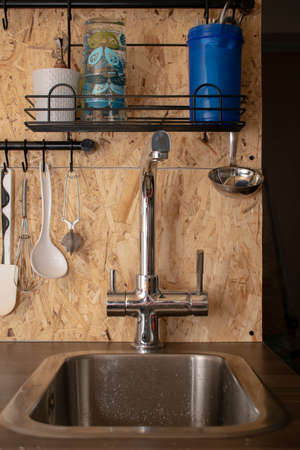 The design of the modern home kitchen in the loft-style and rustic. wooden wall with kitchen utensils, sink, spice and glasses.