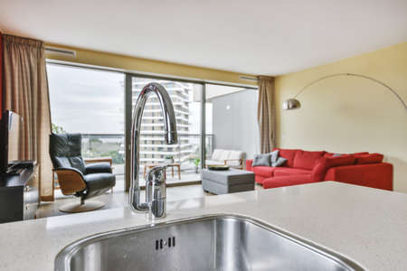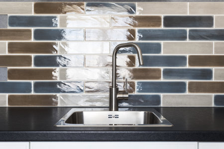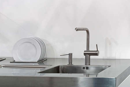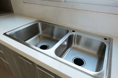 Kitchen sink concept. Clean chrome sink in a modern kitchen with copy space. Marble countertop