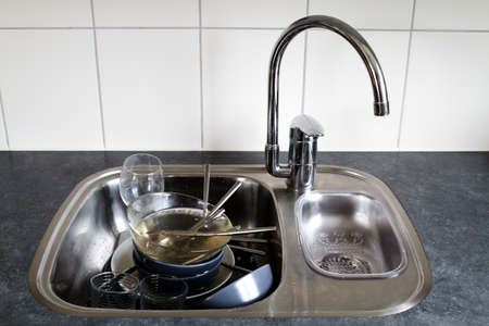 Dirty dishes in wash basin. High contrast, vivid, shiny