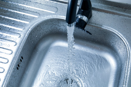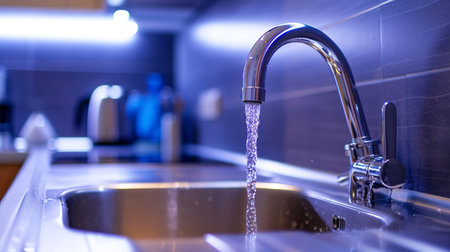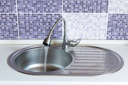 Water flows from the kitchen faucet into the metal sink. Clean water flowing from a chrome tap in the kitchen.